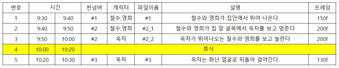 타임테이블에는 촬영 시간, 스토리보드에 있는 씬(컷)넘버, 등장할 캐릭터, 저장될 파일이름등의 내용을 정리.