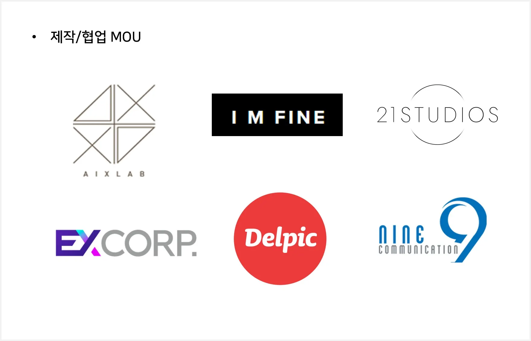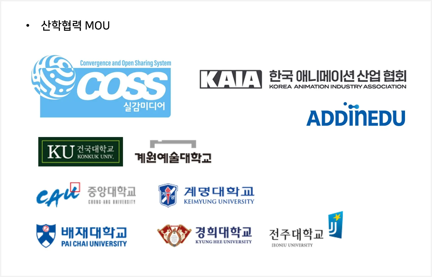 또한 AIXLAB,IMFINE,EXcorp,Delpic,21Studios,나인커뮤니케이션 등 인터랙티브 콘텐츠,XR 솔루션, 영상디자인, IP개발, 홀로그램 및 뉴미디어 등의 실감콘텐츠와 연관된 다양한 영역에서 활발한 활동을 하고 있는 기업들과 실감콘텐츠 개발과 협업을 위한 협약을 통해 영역을 넓혀 나가고 있습니다.